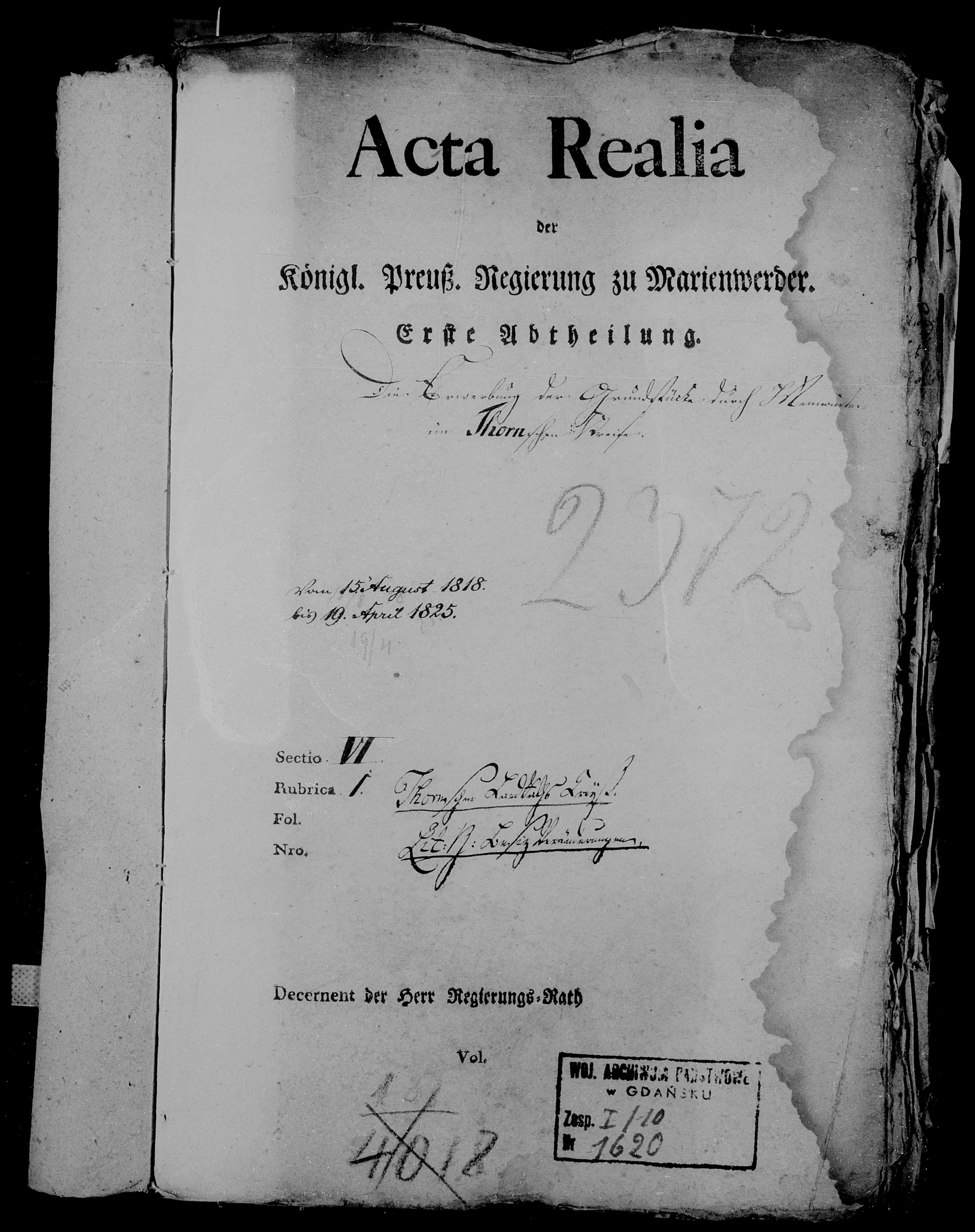 10/10/0/19/1620 („Die Erwerbung der Grundstücke durch Mennoniten im Thornschen Kreise“, 1818–1825)